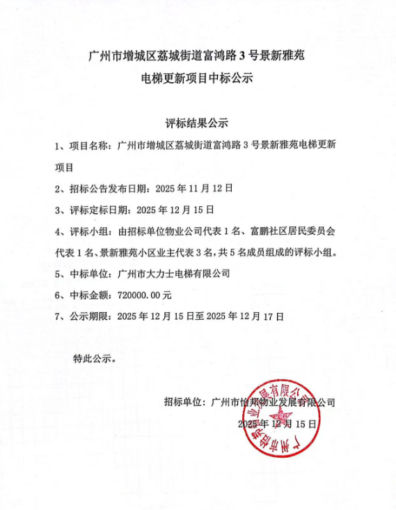 广州市增城区荔城街道富鸿路3号景新雅苑电梯更新项目中标公示
