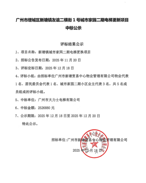广州市增城区新塘镇友谊二横街1号城市家园二期电梯更新项目中标公示