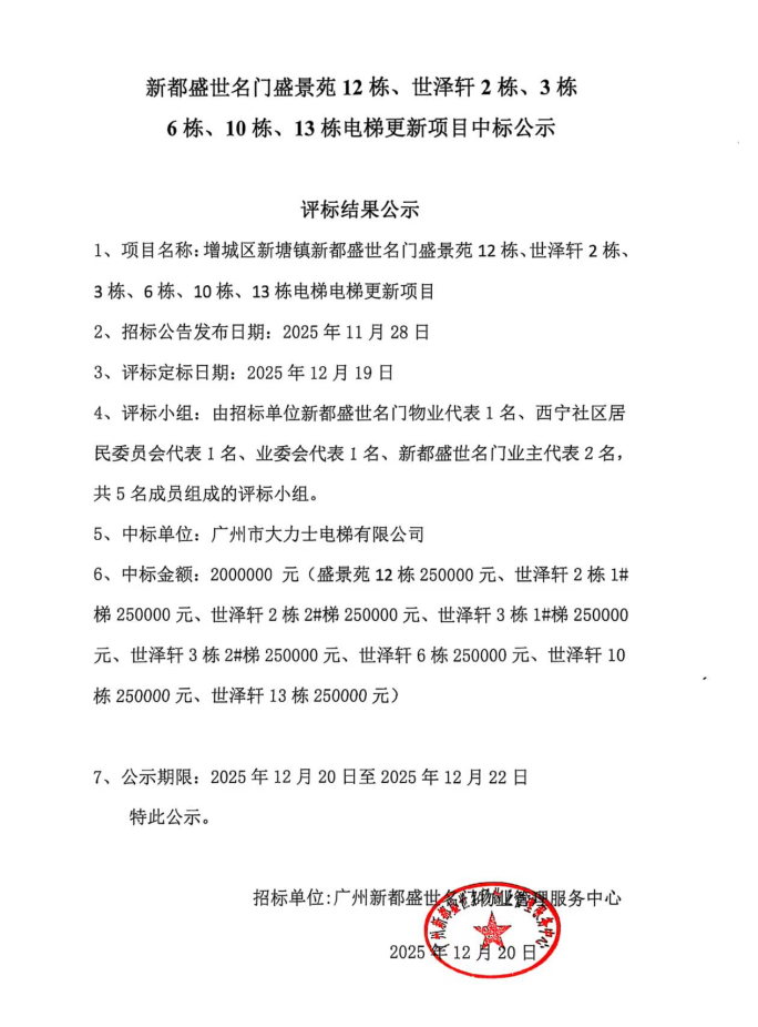 新都盛世名门盛景苑12栋、世泽轩2栋、3栋6栋、10栋、13栋电梯更新项目中标公示